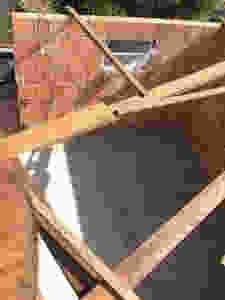 No final do primeiro dia, fiação elétrica realocada, telhas e caibros retirados, material para construção levado até o local e início das paredes.